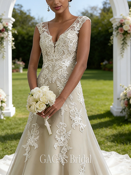 Product Code: GAGA223 Fabric: Lace, Tulle Embellishment: Beading, Sequins Silhouette: A-line Length: Court Train Neckline: V-Neck Built-In Bra: Yes Boning: Yes Straps & Sleeves: Sleeveless Collection: Classic The dress does not include any accessories in the picture, such as wraps/jackets, gloves, veil, handbag, etc. Care & Storage Dresses are usually packed inside out for protection. Hang and store the dress in a shaded and dry place. If available, use the inner hanger straps to assist with hanging. Cleaning & Ironing Do not wash Do not dry clean Professional spot clean only Steam iron the dress at a low temperature