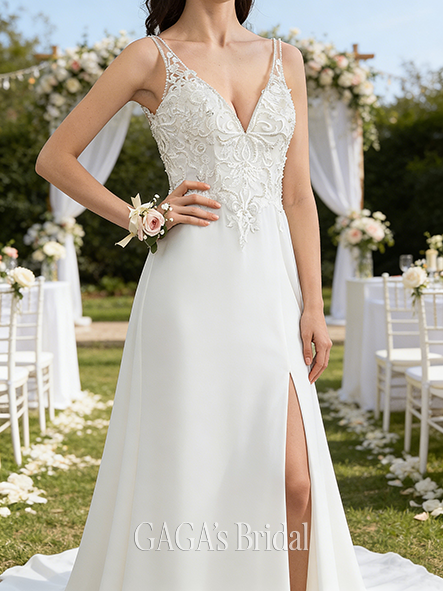 - A-Line Chiffon Elegant V-Neck Floor-Length Wedding Dress