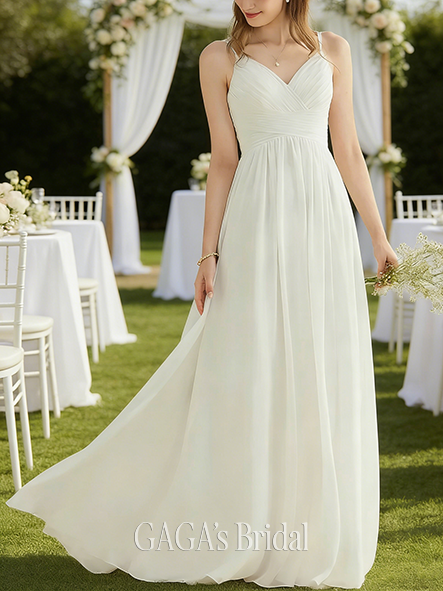 Product Code: GAGA188 Fabric: Chiffon Silhouette: A-line Length: Floor-Length Neckline: V-Neck Back Style: Back Zip Built-In Bra: Yes Boning: No Straps & Sleeves: Sleeveless Collection: Classic The dress does not include any accessories in the picture, such as wraps/jackets, gloves, veil, handbag, etc. Care & Storage Dresses are usually packed inside out for protection. Hang and store the dress in a shaded and dry place. If available, use the inner hanger straps to assist with hanging. Cleaning & Ironing Do not wash Do not dry clean Professional spot clean only Steam iron the dress at a low temperature