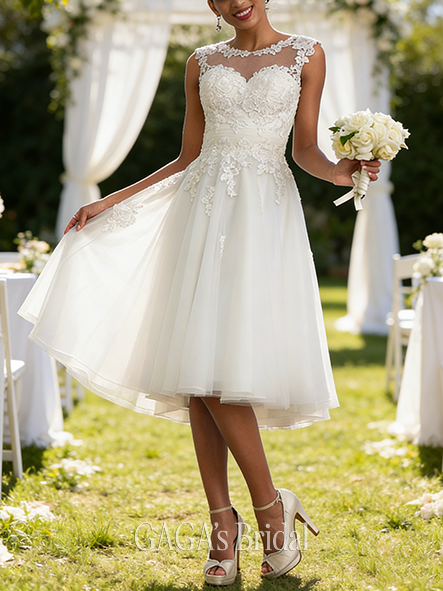 Product Code: GAGA222 Fabric: Lace, Tulle Embellishment: Ruffle Silhouette: A-line Length: Asymmetrical Neckline: Illusion Back Style: Covered Button, Back Zip Built-In Bra: Yes Boning: Yes Straps & Sleeves: Sleeveless Collection: Classic The dress does not include any accessories in the picture, such as wraps/jackets, gloves, veil, handbag, etc. Care & Storage Dresses are usually packed inside out for protection. Hang and store the dress in a shaded and dry place. If available, use the inner hanger straps to assist with hanging. Cleaning & Ironing Do not wash Do not dry clean Professional spot clean only Steam iron the dress at a low temperature