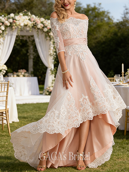 Product Code: GAGA201 Fabric: Lace, Satin, Tulle Embellishment: Sequins Silhouette: A-line Length: Asymmetrical Neckline: Off the Shoulder Back Style: Back Zip Features: No Leg Slit Built-In Bra: Yes Boning: No Straps & Sleeves: 1/2 Sleeve Collection: Classic The dress does not include any accessories in the picture, such as wraps/jackets, gloves, veil, handbag, etc. Care & Storage Dresses are usually packed inside out for protection. Hang and store the dress in a shaded and dry place. If available, use the inner hanger straps to assist with hanging. Cleaning & Ironing Do not wash Do not dry clean Professional spot clean only Steam iron the dress at a low temperature