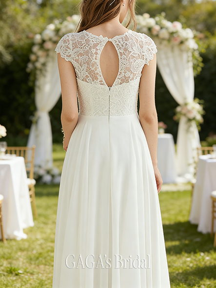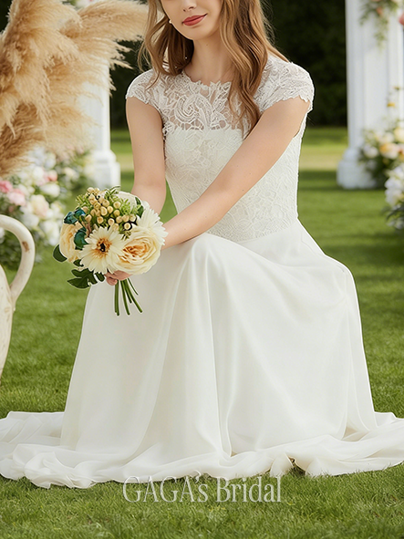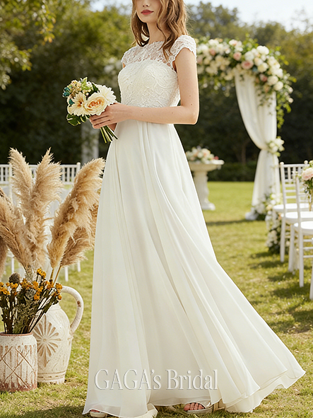 Product Code: GAGA191 Fabric: Chiffon, Lace Silhouette: A-line Length: Floor-Length Neckline: Scoop Back Style: Back Zip Built-In Bra: Yes Boning: No Straps & Sleeves: Short Sleeve Collection: Classic The dress does not include any accessories in the picture, such as wraps/jackets, gloves, veil, handbag, etc. Care & Storage Dresses are usually packed inside out for protection. Hang and store the dress in a shaded and dry place. If available, use the inner hanger straps to assist with hanging. Cleaning & Ironing Do not wash Do not dry clean Professional spot clean only Steam iron the dress at a low temperature