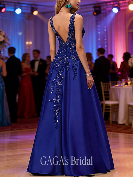 - A-line Sophisticated V-Neck Sweep Train Satin Prom Dresses