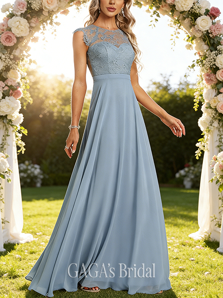 • A-line Dainty Scoop Floor-Length Lace Chiffon Bridesmaid Dress