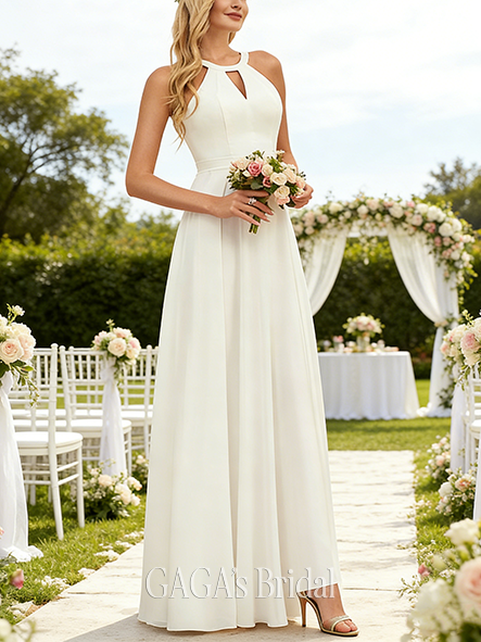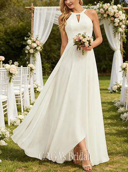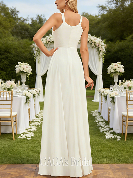 Product Code: AGAGA186 Fabric: Chiffon Silhouette: A-line Length: Floor-Length Neckline: Scoop Back Style: Back Zip Built-In Bra: Yes Boning: No Straps & Sleeves: Sleeveless Collection: Classic The dress does not include any accessories in the picture, such as wraps/jackets, gloves, veil, handbag, etc. Care & Storage Dresses are usually packed inside out for protection. Hang and store the dress in a shaded and dry place. If available, use the inner hanger straps to assist with hanging. Cleaning & Ironing Do not wash Do not dry clean Professional spot clean only Steam iron the dress at a low temperature