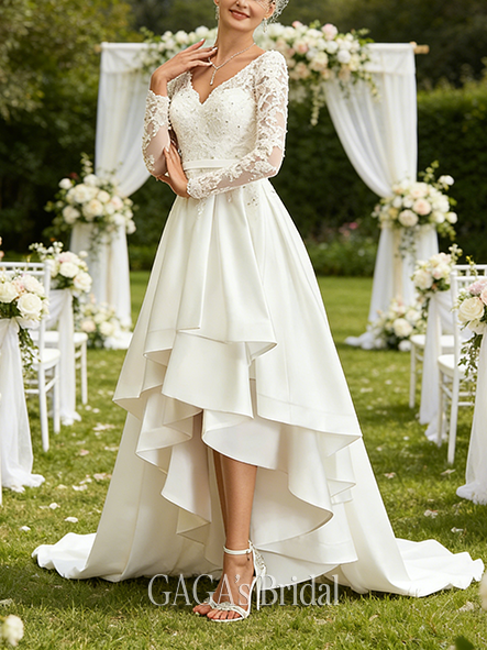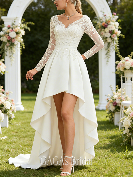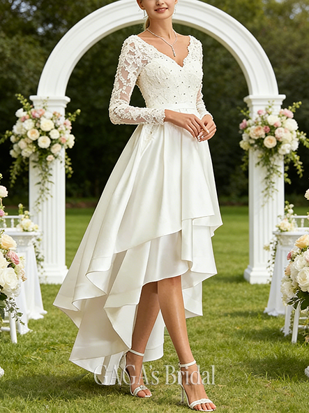 Product Code: AGAGA185 Fabric: Lace, Satin Silhouette: A-line Length: Asymmetrical Neckline: V-Neck Back Style: Back Zip Built-In Bra: Yes Boning: No Straps & Sleeves: Long Sleeve Collection: Classic The dress does not include any accessories in the picture, such as wraps/jackets, gloves, veil, handbag, etc. Care & Storage Dresses are usually packed inside out for protection. Hang and store the dress in a shaded and dry place. If available, use the inner hanger straps to assist with hanging. Cleaning & Ironing Do not wash Do not dry clean Professional spot clean only Steam iron the dress at a low temperature