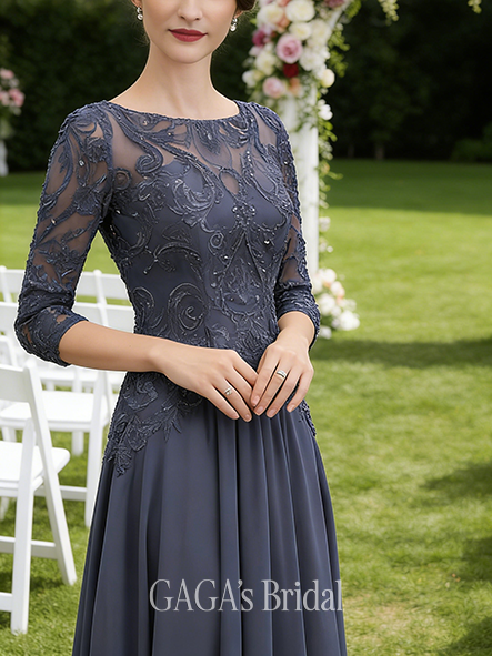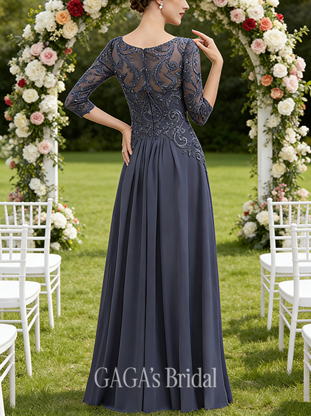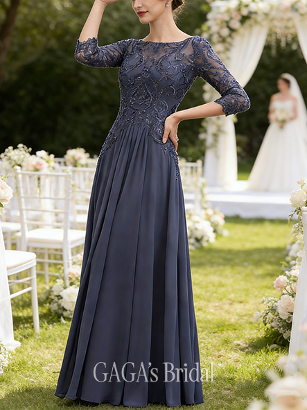 • Fall A-line Sophisticated Boat Neck Illusion Floor-Length Chiffon Lace Mother of the Bride Dress With Sequins Beading