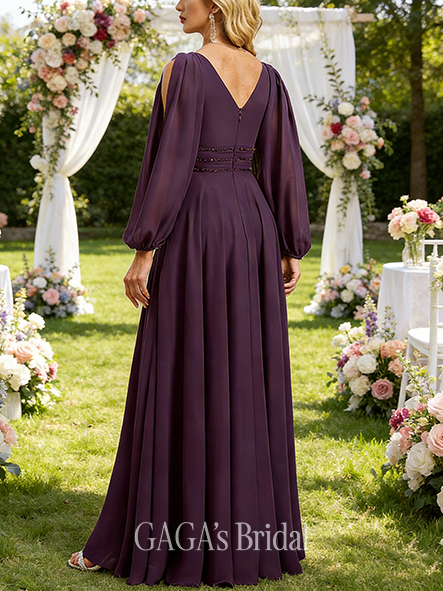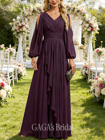 • Fall A-line Sophisticated Cold Shoulder V-Neck Floor-Length Chiffon Mother of the Bride Dress With Cascading Ruffles Beading