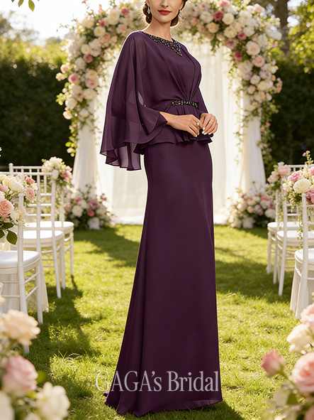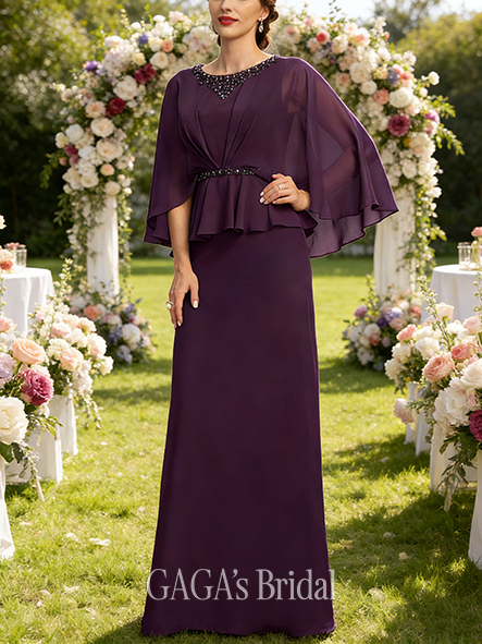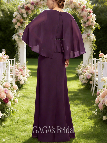 • Fall A-line Sophisticated Scoop Floor-Length Chiffon Mother of the Bride Dress With Beading Cape Sequins Pleated