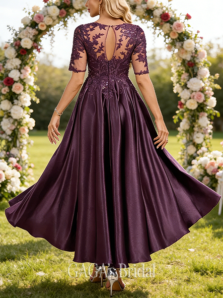 • Fall A-line Sophisticated Scoop Illusion Asymmetrical Stretch Satin Lace Mother of the Bride Dress With Sequins
