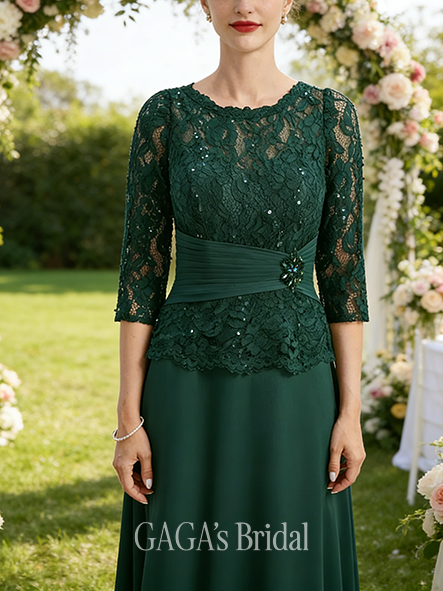 • Fall A-line Sophisticated Scoop Illusion Floor-Length Chiffon Lace Mother of the Bride Dress With Pleated Sequins Beading