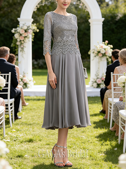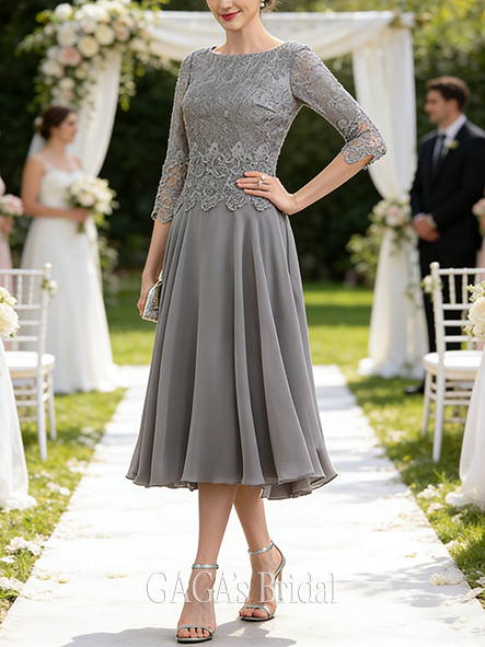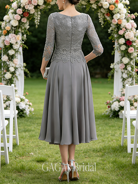 • Fall A-line Sophisticated Scoop Tea-Length Lace Chiffon Mother of the Bride Dress