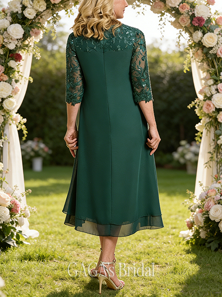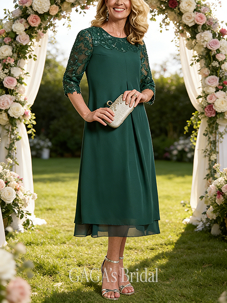 • Fall A-line Sophisticated Scoop Tea-Length Lace Chiffon Mother of the Bride Dress With Sequins