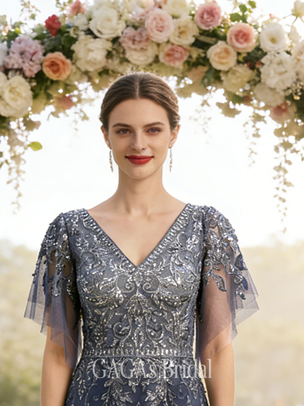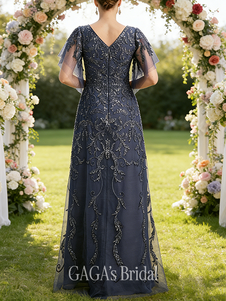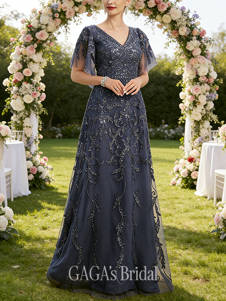 • Fall A-line Sophisticated V-Neck Floor-Length Tulle Lace Mother of the Bride Dress With Sequins