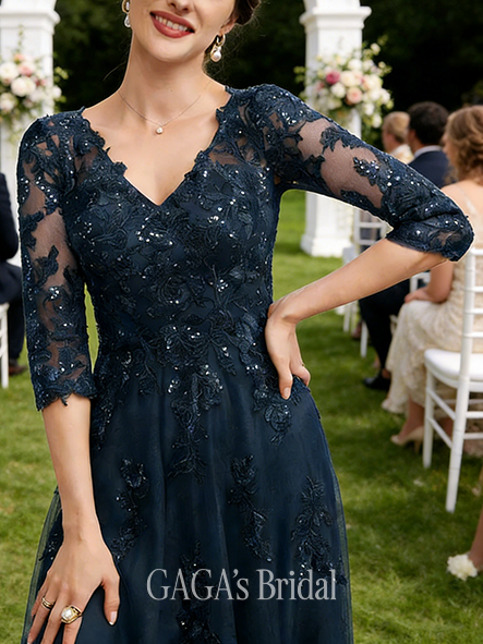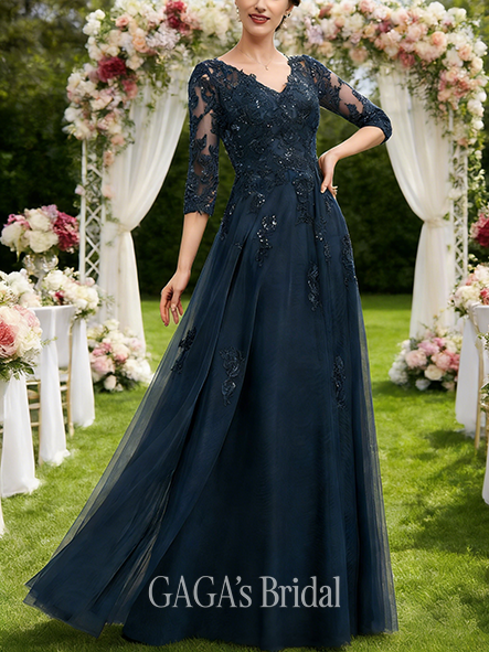 • Fall A-line Sophisticated V-Neck Floor-Length Tulle Lace Mother of the Bride Dress With Sequins