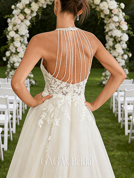 - Halter Neck A-Line Lace Chiffon Gown