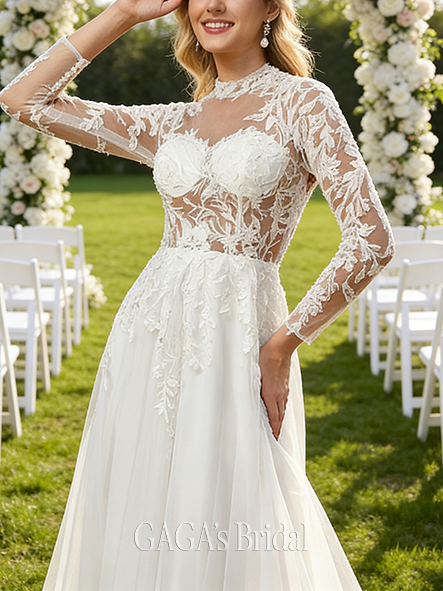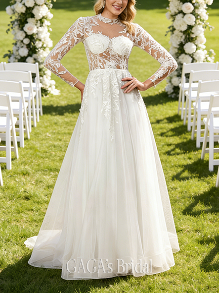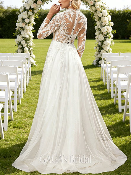 - V-Neck A-Line Lace Tulle Wedding Dress