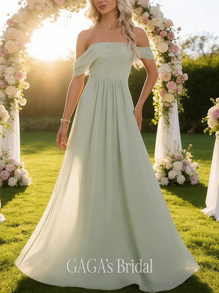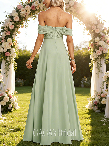 • Maternity Friendly A-line Beautiful Off the Shoulder Floor-Length Chiffon Bridesmaid Dress With Ruffle Ruched