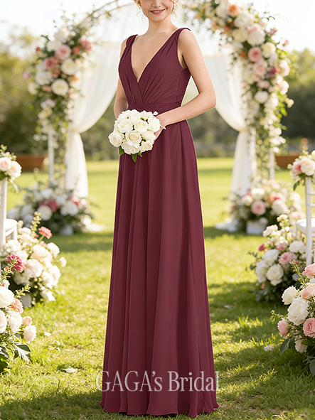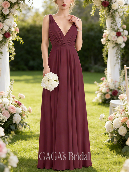 • Maternity Friendly A-line Tidy V-Neck Floor-Length Chiffon Bridesmaid Dress With Pleated