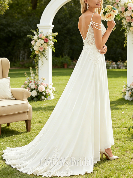 Product Code: NGAGA182 Fabric: Chiffon, Lace Embellishment: Beading, Sequins Silhouette: A-line Length: Sweep Train Neckline: V-Neck Back Style: Covered Button Built-In Bra: Yes Boning: No Straps & Sleeves: Spaghetti Straps Collection: Classic The dress does not include any accessories in the picture, such as wraps/jackets, gloves, veil, handbag, etc. Care & Storage Dresses are usually packed inside out for protection. Hang and store the dress in a shaded and dry place. If available, use the inner hanger straps to assist with hanging. Cleaning & Ironing Do not wash Do not dry clean Professional spot clean only Steam iron the dress at a low temperature