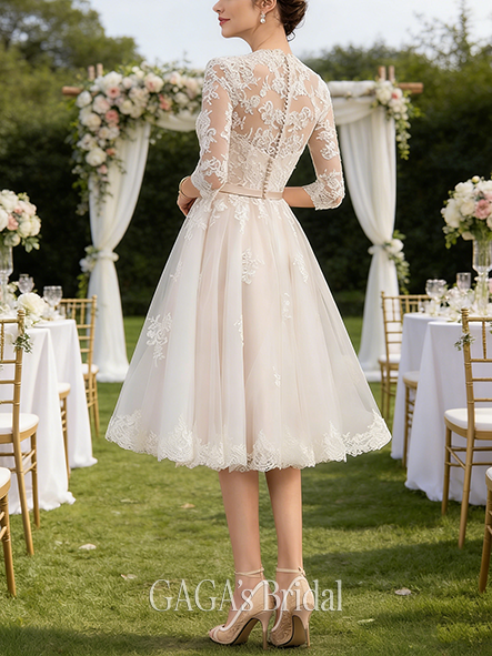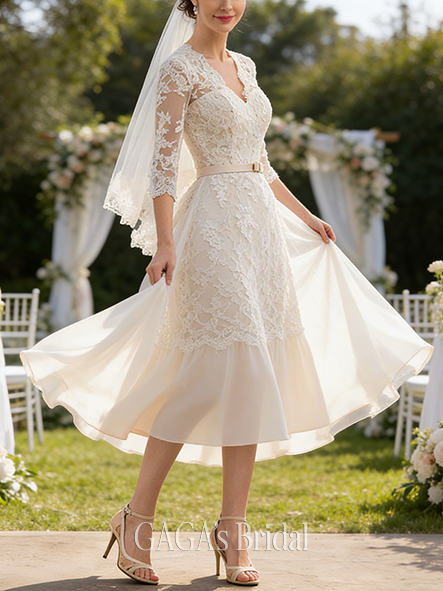 Product Code: NGAGA216 Fabric: Lace, Tulle Embellishment: Bow Silhouette: A-line Length: Knee-Length Neckline: V-Neck Back Style: Covered Button, Back Zip Built-In Bra: Yes Boning: Yes Straps & Sleeves: 1/2 Sleeve Collection: Classic The dress does not include any accessories in the picture, such as wraps/jackets, gloves, veil, handbag, etc. Care & Storage Dresses are usually packed inside out for protection. Hang and store the dress in a shaded and dry place. If available, use the inner hanger straps to assist with hanging. Cleaning & Ironing Do not wash Do not dry clean Professional spot clean only Steam iron the dress at a low temperature