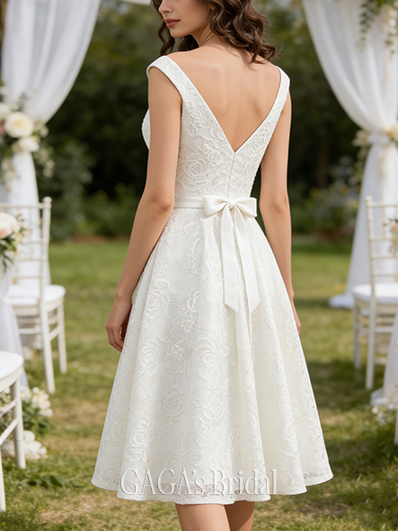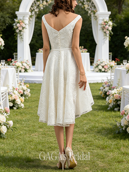 Product Code: NGAGA214 Fabric: Lace Embellishment: Bow Silhouette: A-line Length: Asymmetrical Neckline: V-Neck Back Style: Back Zip Features: No Leg Slit Built-In Bra: Yes Boning: Yes Straps & Sleeves: Sleeveless Collection: Classic The dress does not include any accessories in the picture, such as wraps/jackets, gloves, veil, handbag, etc. Care & Storage Dresses are usually packed inside out for protection. Hang and store the dress in a shaded and dry place. If available, use the inner hanger straps to assist with hanging. Cleaning & Ironing Do not wash Do not dry clean Professional spot clean only Steam iron the dress at a low temperature