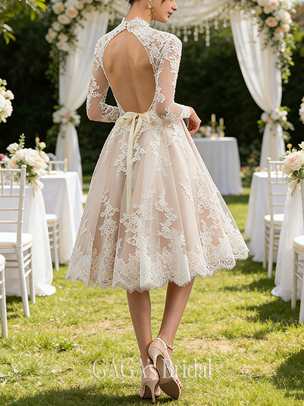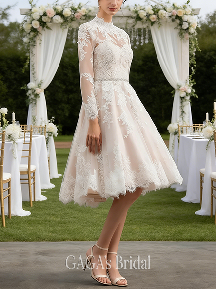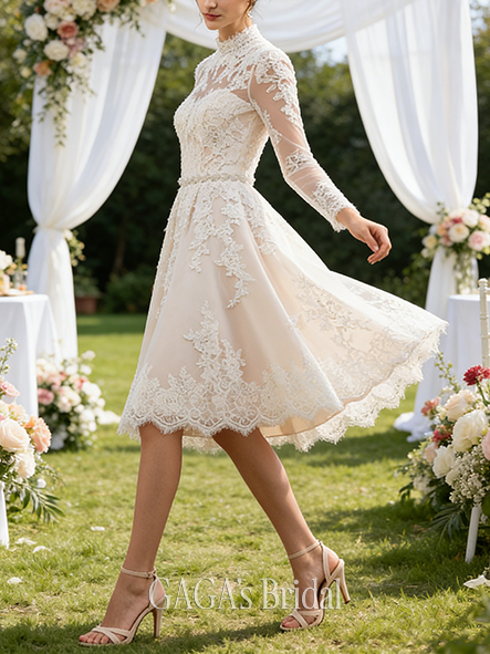 Product Code: NGAGA215 Fabric: Lace, Tulle Silhouette: A-line Length: Knee-Length Neckline: Illusion Back Style: Back Zip Built-In Bra: Yes Boning: Yes Straps & Sleeves: Long Sleeve Collection: Classic The dress does not include any accessories in the picture, such as wraps/jackets, gloves, veil, handbag, etc. Care & Storage Dresses are usually packed inside out for protection. Hang and store the dress in a shaded and dry place. If available, use the inner hanger straps to assist with hanging. Cleaning & Ironing Do not wash Do not dry clean Professional spot clean only Steam iron the dress at a low temperature