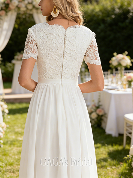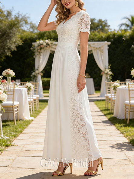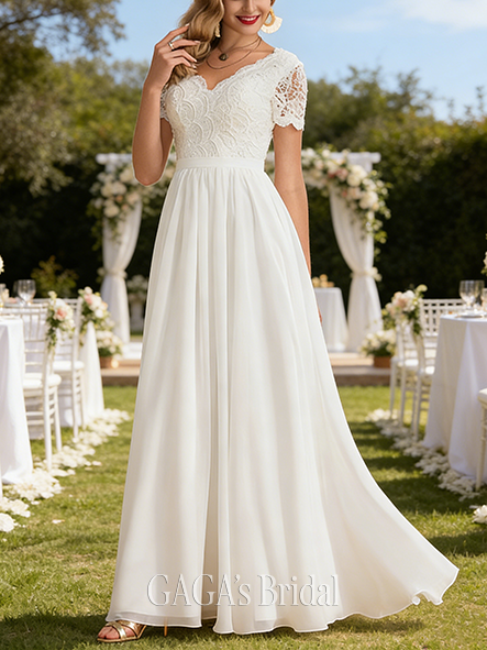 Product Code: NGAGA197 Fabric: Chiffon, Lace Silhouette: A-line Length: Floor-Length Neckline: V-Neck Back Style: Back Zip Built-In Bra: Yes Boning: No Straps & Sleeves: Short Sleeve Collection: Classic The dress does not include any accessories in the picture, such as wraps/jackets, gloves, veil, handbag, etc. Care & Storage Dresses are usually packed inside out for protection. Hang and store the dress in a shaded and dry place. If available, use the inner hanger straps to assist with hanging. Cleaning & Ironing Do not wash Do not dry clean Professional spot clean only Steam iron the dress at a low temperature