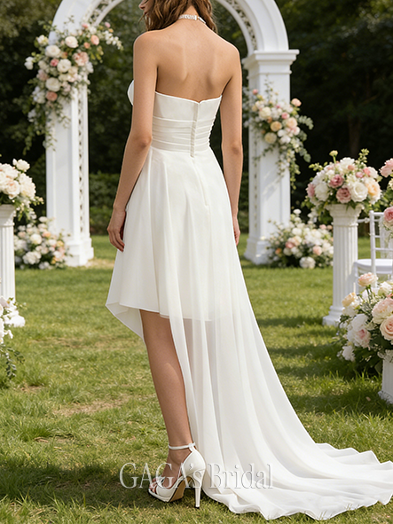 Product Code: NGAGA227 Fabric: Chiffon Embellishment: Ruffle Silhouette: A-line Length: Asymmetrical Neckline: Sweetheart Back Style: Back Zip Built-In Bra: Yes Boning: Yes Straps & Sleeves: Sleeveless, Strapless Collection: Classic The dress does not include any accessories in the picture, such as wraps/jackets, gloves, veil, handbag, etc. Care & Storage Dresses are usually packed inside out for protection. Hang and store the dress in a shaded and dry place. If available, use the inner hanger straps to assist with hanging. Cleaning & Ironing Do not wash Do not dry clean Professional spot clean only Steam iron the dress at a low temperature
