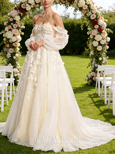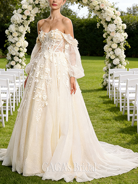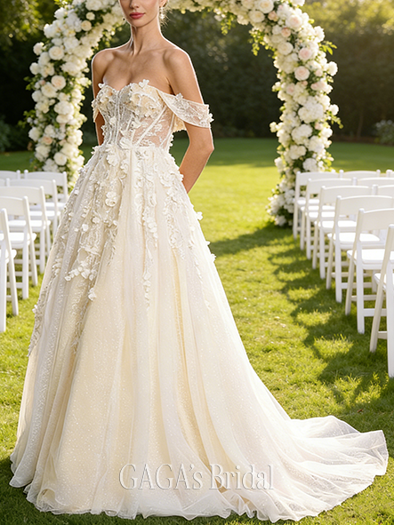 - Straight Off-the-Shoulder A-Line Tulle Lace Gown