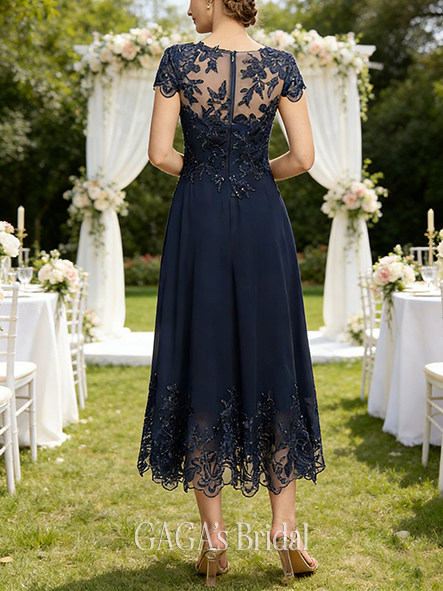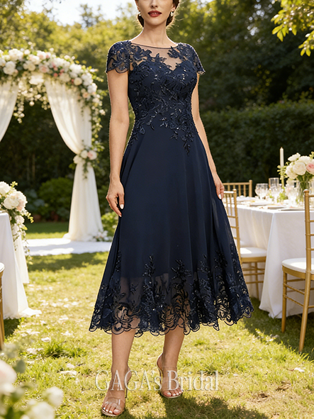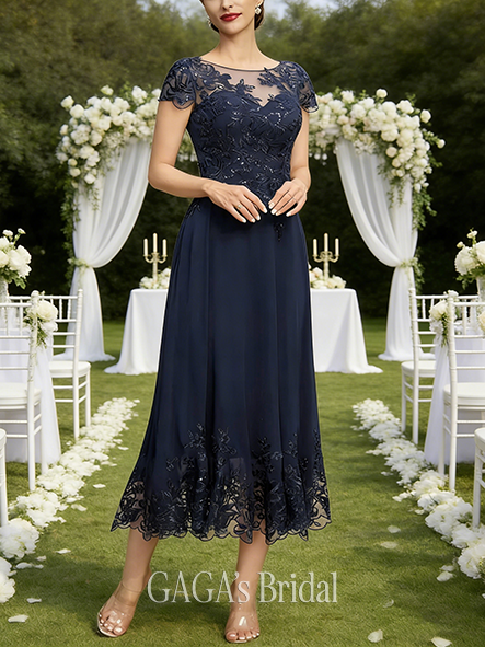 • New Arrival A-line Refined Chic Scoop Illusion Tea-Length Lace Chiffon Mother of the Bride Dress With Sequins