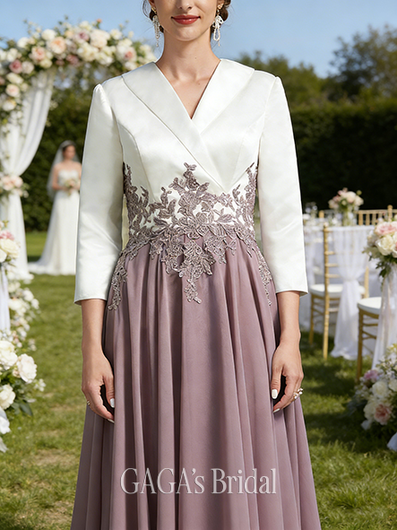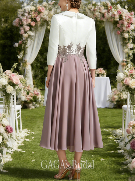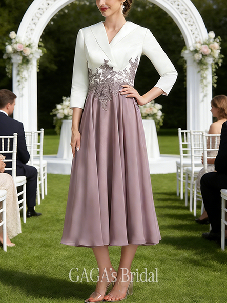 • New Arrival A-line Refined Graceful Collared V-Neck Tea-Length Satin Chiffon Mother of the Bride Dress With Appliques Lace