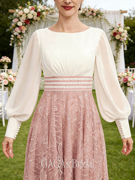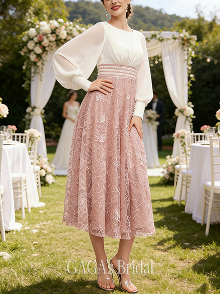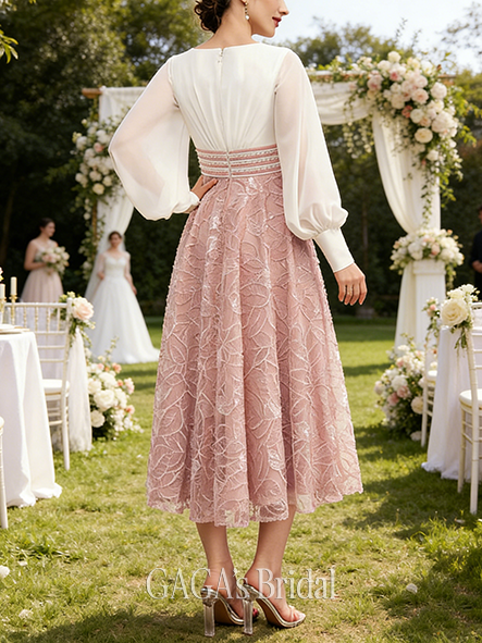 • New Arrival A-line Sophisticated Chic Scoop Tea-Length Chiffon Lace Mother of the Bride Dress With Pleated Sequins Beading
