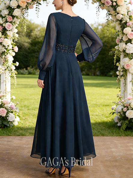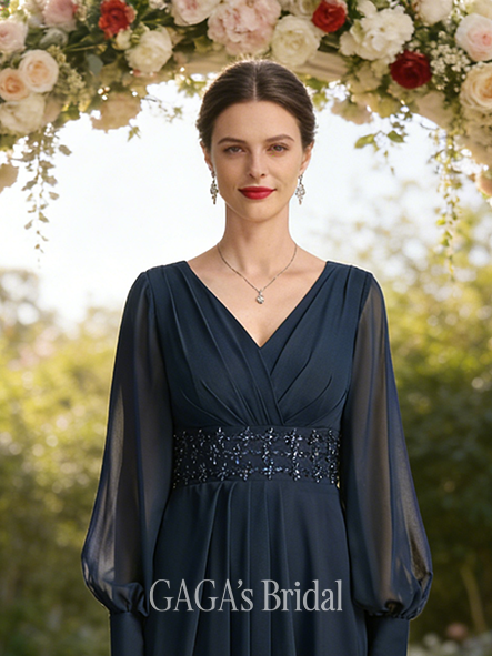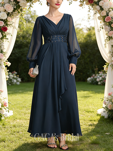 • New Arrival A-line Sophisticated Chic V-Neck Ankle-Length Chiffon Mother of the Bride Dress With Cascading Ruffles Beading Sequins