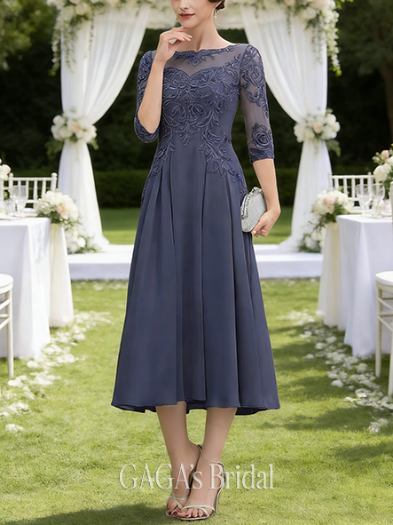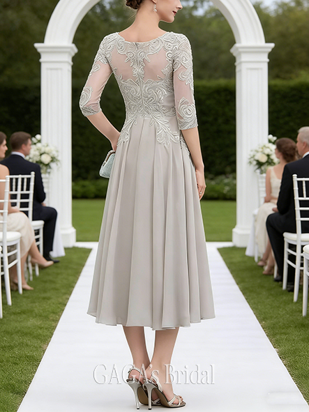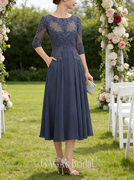 • New Arrival A-line Sophisticated Graceful Scoop Illusion Tea-Length Chiffon Lace Mother of the Bride Dress With Sequins Beading