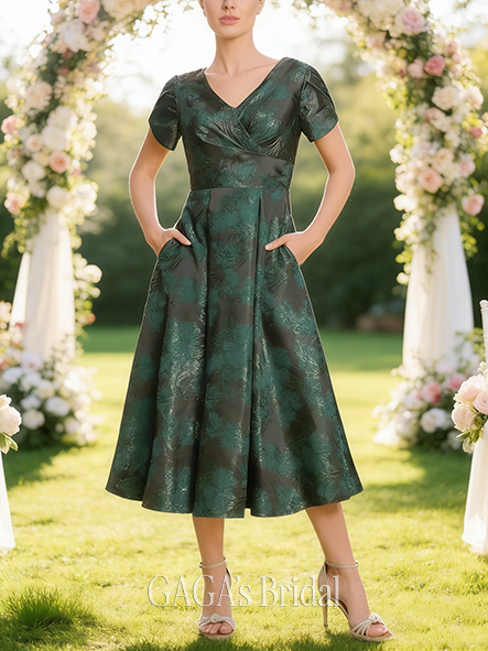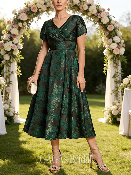 • Plus Size A-line Chic Luxury V-Neck Tea-Length Jacquard Floral Mother of the Bride Dress With Pleated