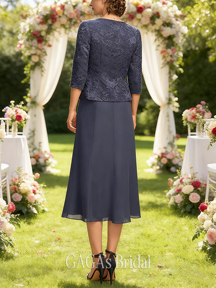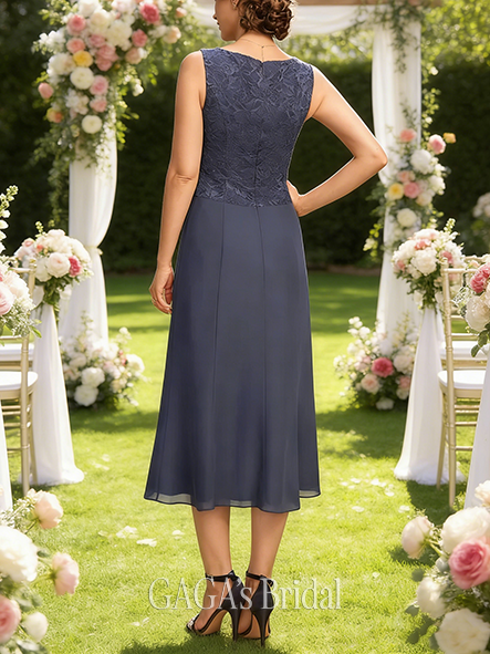 • Plus Size A-line Dignified Square Tea-Length Lace Chiffon Mother of the Bride Dress