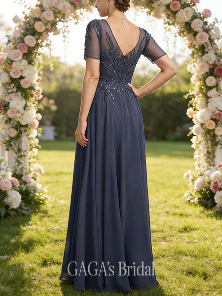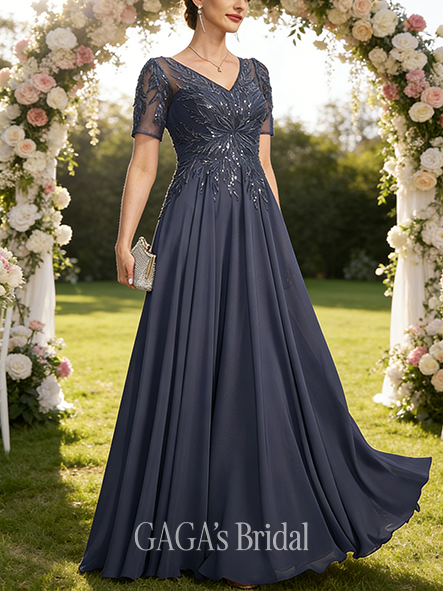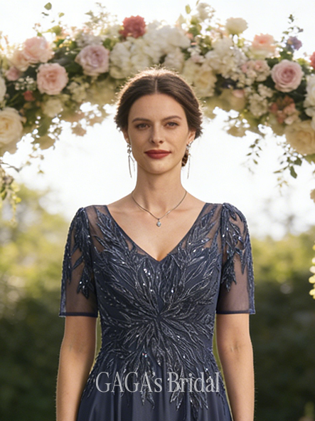 • Plus Size A-line Exquisite Luxury V-Neck Illusion Floor-Length Lace Chiffon Mother of the Bride Dress With Sequins