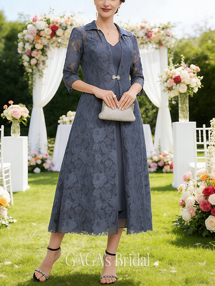 • Plus Size A-line Refined Chic V-Neck Tea-Length Chiffon Mother of the Bride Dress