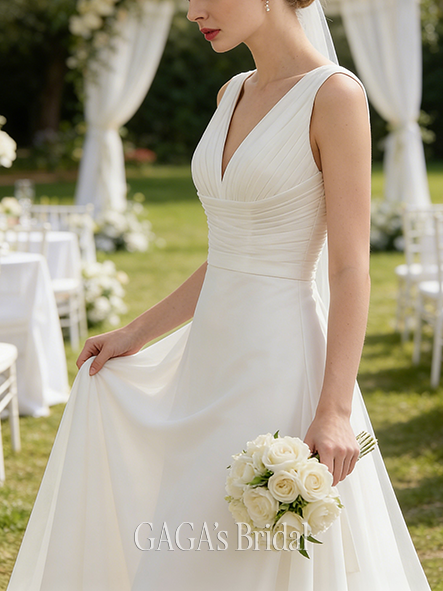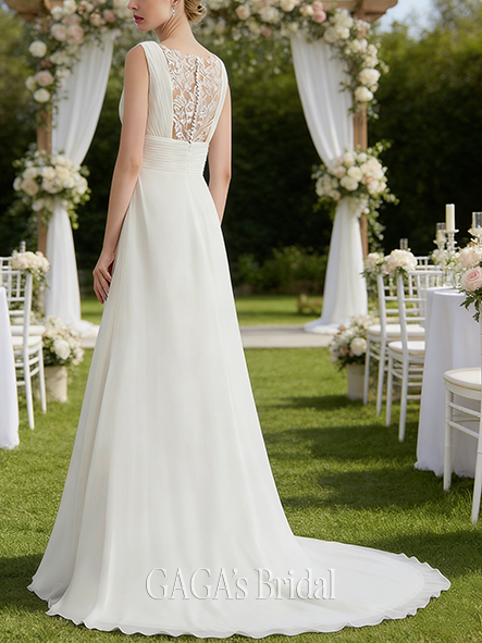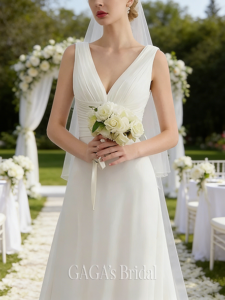 Product Code: PSGAGA221 Fabric: Chiffon, Lace Embellishment: Ruffle Silhouette: A-line Length: Sweep Train Neckline: V-Neck Back Style: Covered Button, Back Zip Built-In Bra: Yes Boning: Yes Straps & Sleeves: Sleeveless Collection: Classic The dress does not include any accessories in the picture, such as wraps/jackets, gloves, veil, handbag, etc. Care & Storage Dresses are usually packed inside out for protection. Hang and store the dress in a shaded and dry place. If available, use the inner hanger straps to assist with hanging. Cleaning & Ironing Do not wash Do not dry clean Professional spot clean only Steam iron the dress at a low temperature