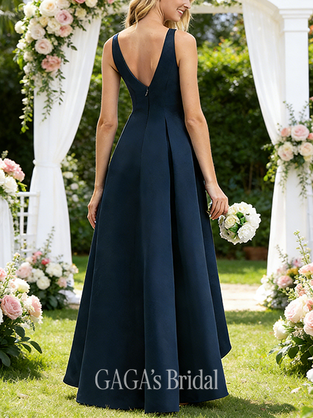 • Short A-line Streamlined Scoop Asymmetrical Satin Bridesmaid Dress