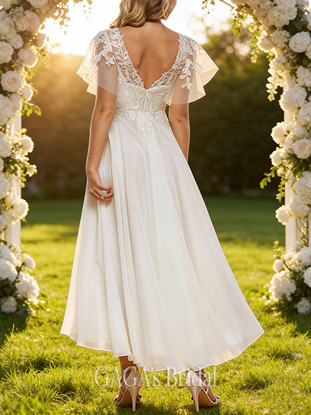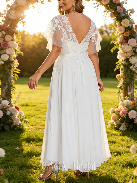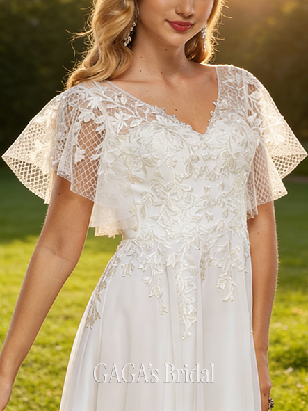 - Elegant V-Neck A-Line Lace Chiffon Wedding Dress