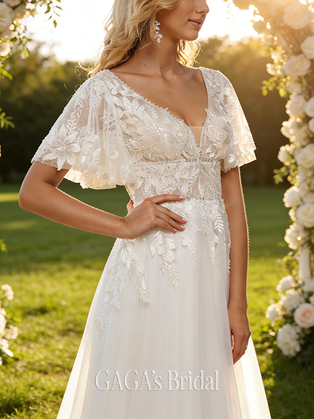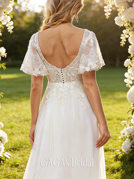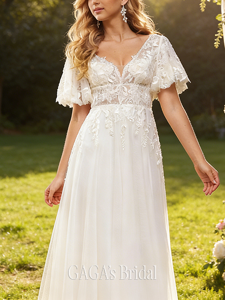- V-Neck A-Line Lace Chiffon Wedding Dress