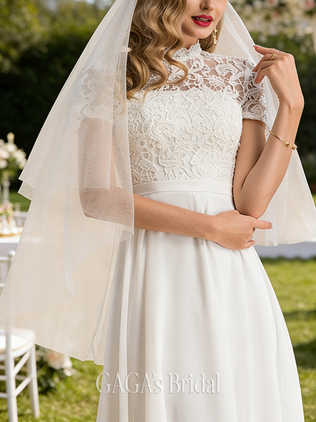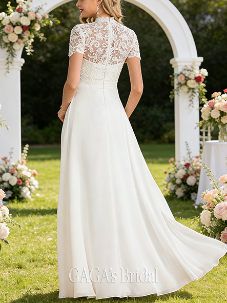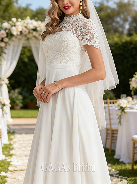 Product Code: UTGAGA203 Fabric: Chiffon, Lace Silhouette: A-line Length: Floor-Length Neckline: High Neck Back Style: Back Zip Built-In Bra: Yes Boning: No Straps & Sleeves: Short Sleeve Collection: Classic The dress does not include any accessories in the picture, such as wraps/jackets, gloves, veil, handbag, etc. Care & Storage Dresses are usually packed inside out for protection. Hang and store the dress in a shaded and dry place. If available, use the inner hanger straps to assist with hanging. Cleaning & Ironing Do not wash Do not dry clean Professional spot clean only Steam iron the dress at a low temperature