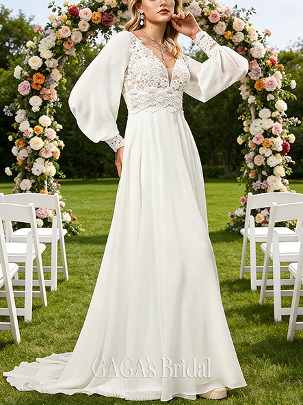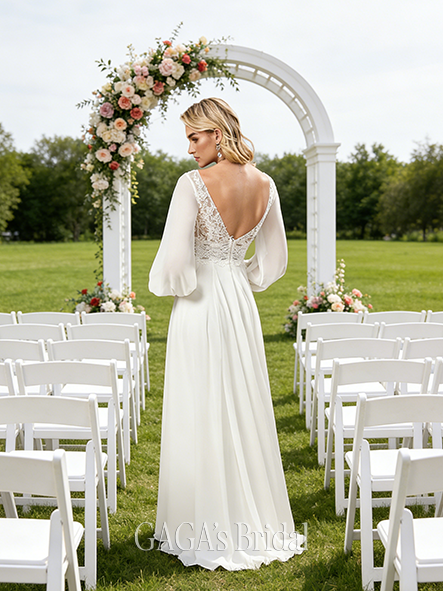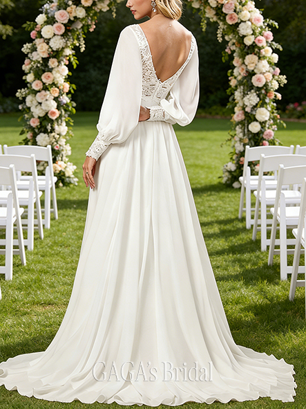 - V-Neck A-Line Lace Chiffon Wedding Dress