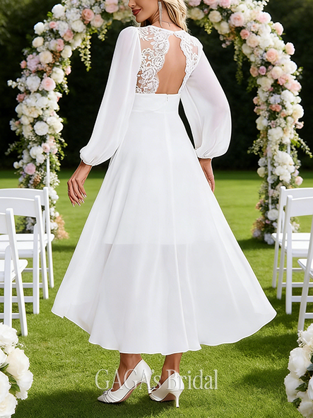 Product Code: GAGA24 Fabric: Chiffon, Lace Silhouette: A-line Length: Asymmetrical, Tea-Length Neckline: V-Neck Back Style: Illusion Built-In Bra: NO Boning: No Special Offer: Special Offer Straps & Sleeves: Long Sleeve Collection: Classic The dress does not include any accessories in the picture, such as wraps/jackets, gloves, veil, handbag, etc. Care & Storage Dresses are usually packed inside out for protection. Hang and store the dress in a shaded and dry place. If available, use the inner hanger straps to assist with hanging. Cleaning & Ironing Do not wash Do not dry clean Professional spot clean only Steam iron the dress at a low temperature