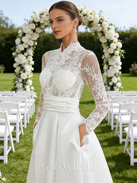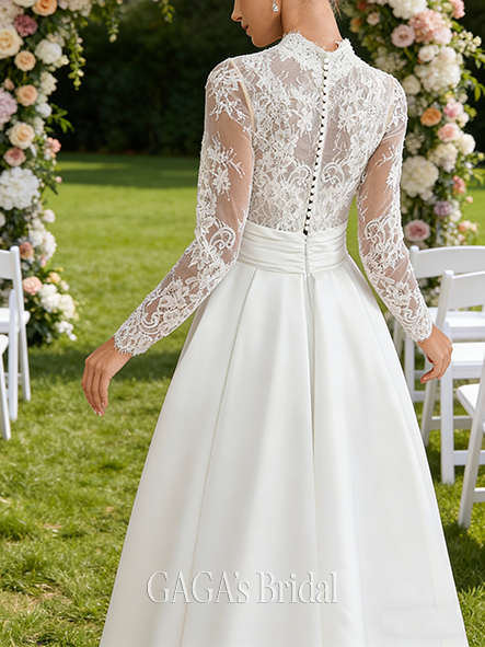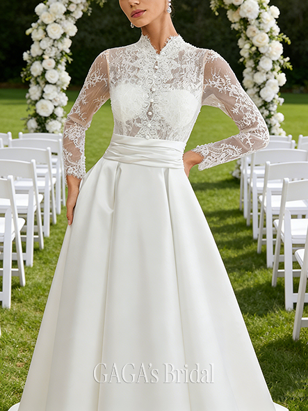 - Scoop Illusion Neck A-Line Lace Satin Gown