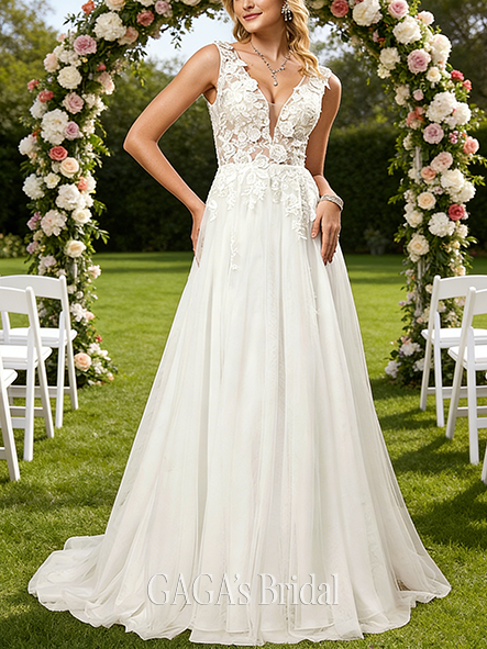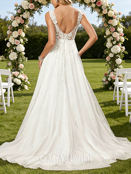 - Square Neck A-Line Tulle Lace Wedding Dress