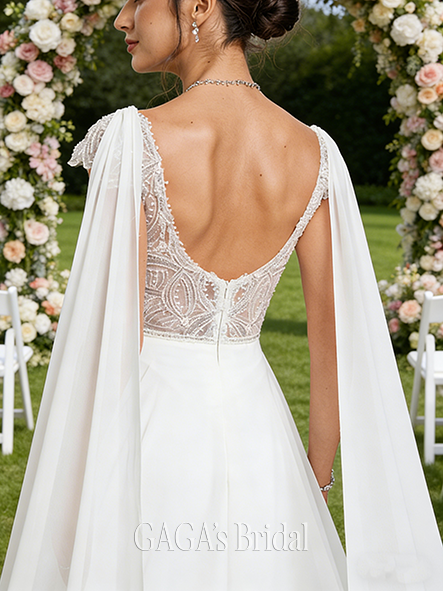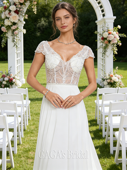 - V-Neck A-Line Lace Chiffon Wedding Dress
