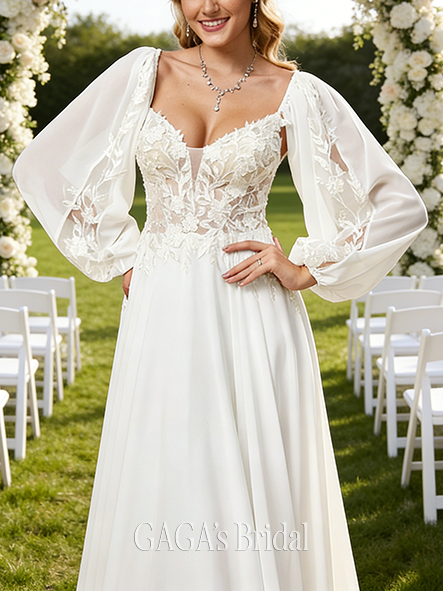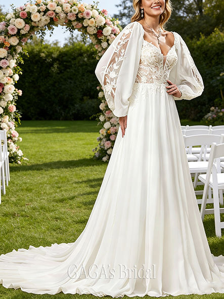 - V-Neck A-Line Lace Chiffon Gown